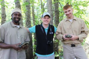 Turtle technicians x and x hold healthy western pond turtles prior to releasing them. The turtle program staff sponsor, Shaun Piliponis, stands with them. Photo by Sadie Gilliom.