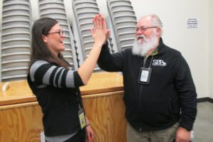 Christina Stalnaker, SPP Roots of Success Coordinator, and Chuck Hudgins, Correctional Industries Food Group Statewide Sustainability Manager, talk about sustainability project plans and ideas after graduation. Photo by Joslyn Rose Trivett.